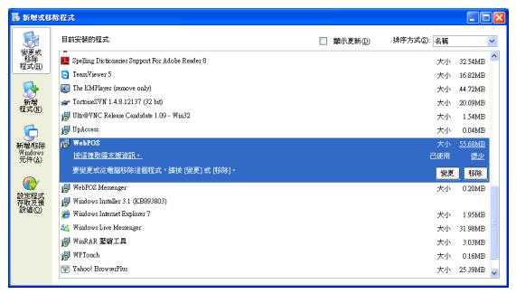 點入新增移除程式進入安裝程式清單,下拉至W開頭的位置,若是看到WebPOS這個應用程式,便表示安裝完成了。